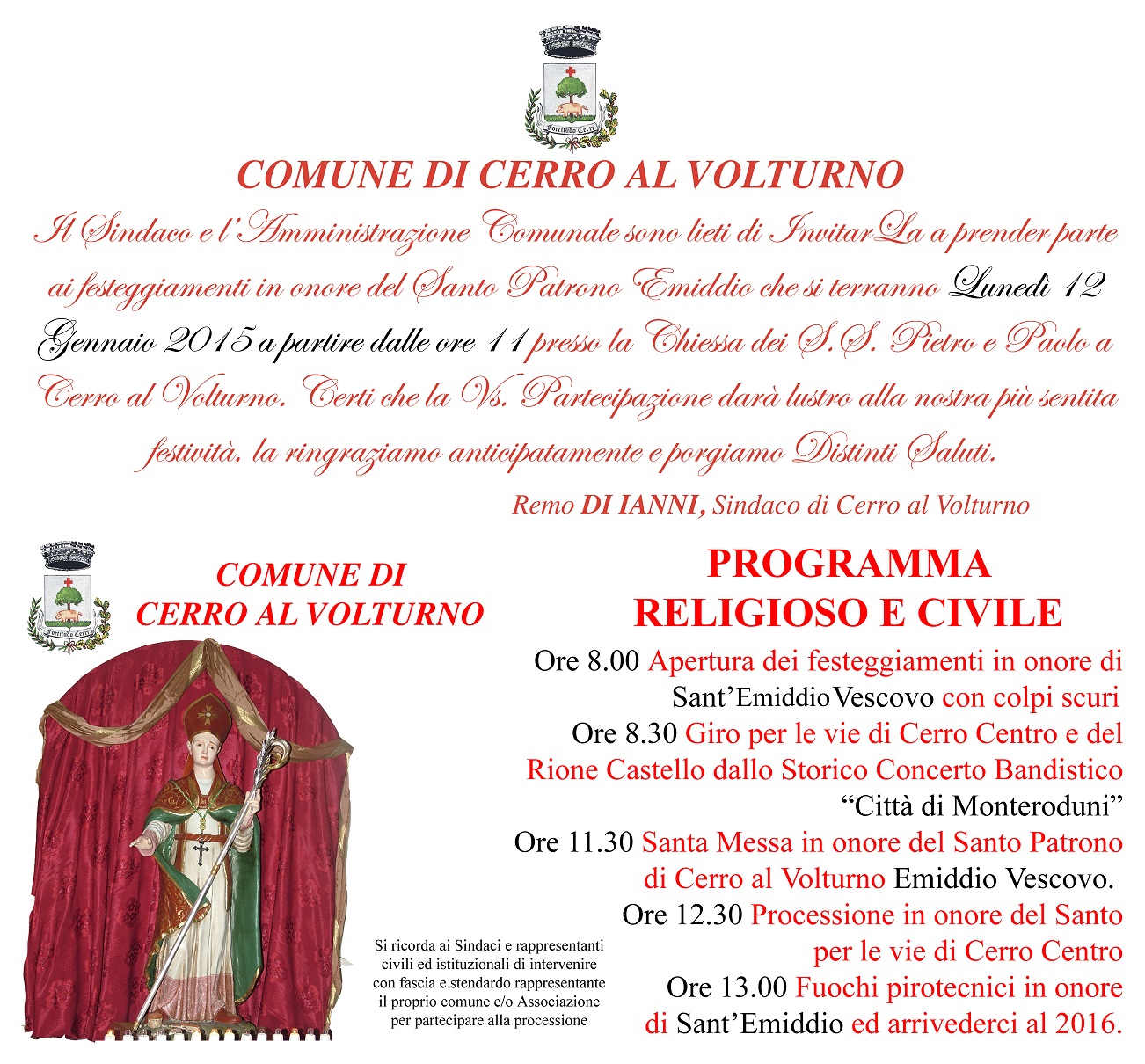 CERRO AL VOLTURNO – Il Sindaco e l’Amministrazione Comunale annunciano che le celebrazioni in onore del Patrono di Cerro al Volturno, Sant’Emiddio Vescovo, si terranno Lunedì 12 Gennaio (a partire dalle ore 11), presso la Chiesa dei S.S. Pietro e Paolo, in Piazza Giacomo Sedati.