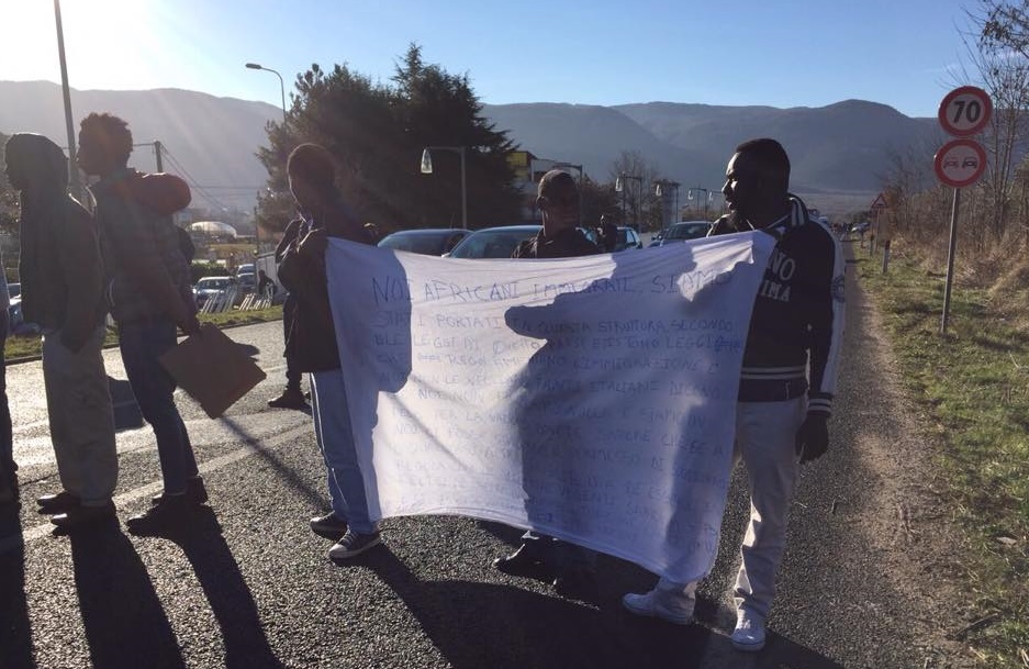 AGGIORNAMENTO – Ore 10.06 – Dopo una concitata trattativa con gli uomini della Questura di Isernia, i profughi hanno liberato la Statale 85, “ripiegando” sul piazzale dell’Hotel Holiday, dove stanno continuando la loro protesta. La situazione del traffico si sta normalizzando. Si attende di conoscere le ragioni che hanno indotto gli extracomunitari a scendere in strada, anche se pare di capire (dai cartelli esposti) che si tratti della mancata concessione di non meglio precisati “documenti”. Indiscrezioni da confermare, inoltre, riferiscono che ieri sera presso il centro di accoglienza di Monteroduni siano giunti altri profughi (più di dieci).