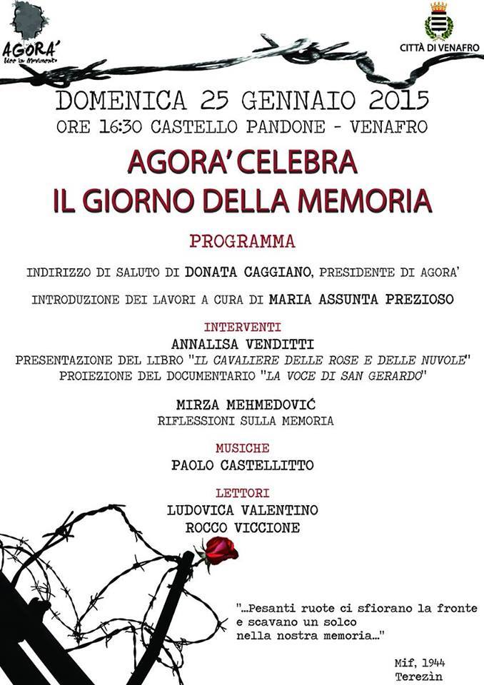 Da sempre, la piazza, cui si richiama il nome dell’Associazione, è locus civicus e, quindi, luogo in cui la comunità fa memoria del proprio passato: pertanto, in quest’anno in cui ricorrono il settantesimo anniversario dalla Liberazione e i cento anni dall’ingresso nella grande guerra dell’Italia, Agorà ha avvertito la necessità di ripensare il passato, come invito a non trascurare la memoria e ammonimento a non ricadere nella spirale dell’odio. L’appuntamento – significativamente intitolato Agorà celebra la Giornata della Memoria – vedrà ospiti Annalisa Venditti e Mirza Mehemedovic, introdotti e condotti da Maria Assunta Prezioso.