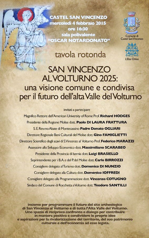 SAN VINCENZO AL VOLTURNO – “Una visione comune e condivisa per il futuro dell’Alta Valle del Volturno”, questo il titolo dell’importante convegno in programma per il pomeriggio di domani (mercoledì 4 febbraio), alle 16.30, presso la sala polivalente “Oscar Notardonato” di Castel San Vincenzo. Il fine dell’iniziativa è quello di “contribuire a programmare il futuro del sito archeologico di San Vincenzo e di tutta l’ Alta Valle del Volturno”. La locandina dell’evento: