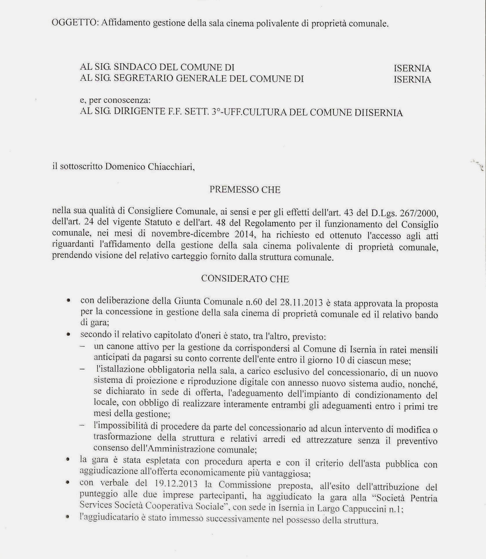 ISERNIA – Gestione della sala cinema polivalente comunale “Lumiere”, il consigliere comunale di minoranza Domenico Chiacchiari scrive al sindaco Luigi Brasiello e al segretario generale del Comune, chiedendo la revoca dell’affidamento concesso, nel dicembre del 2013, alla società “Pentria Services”.