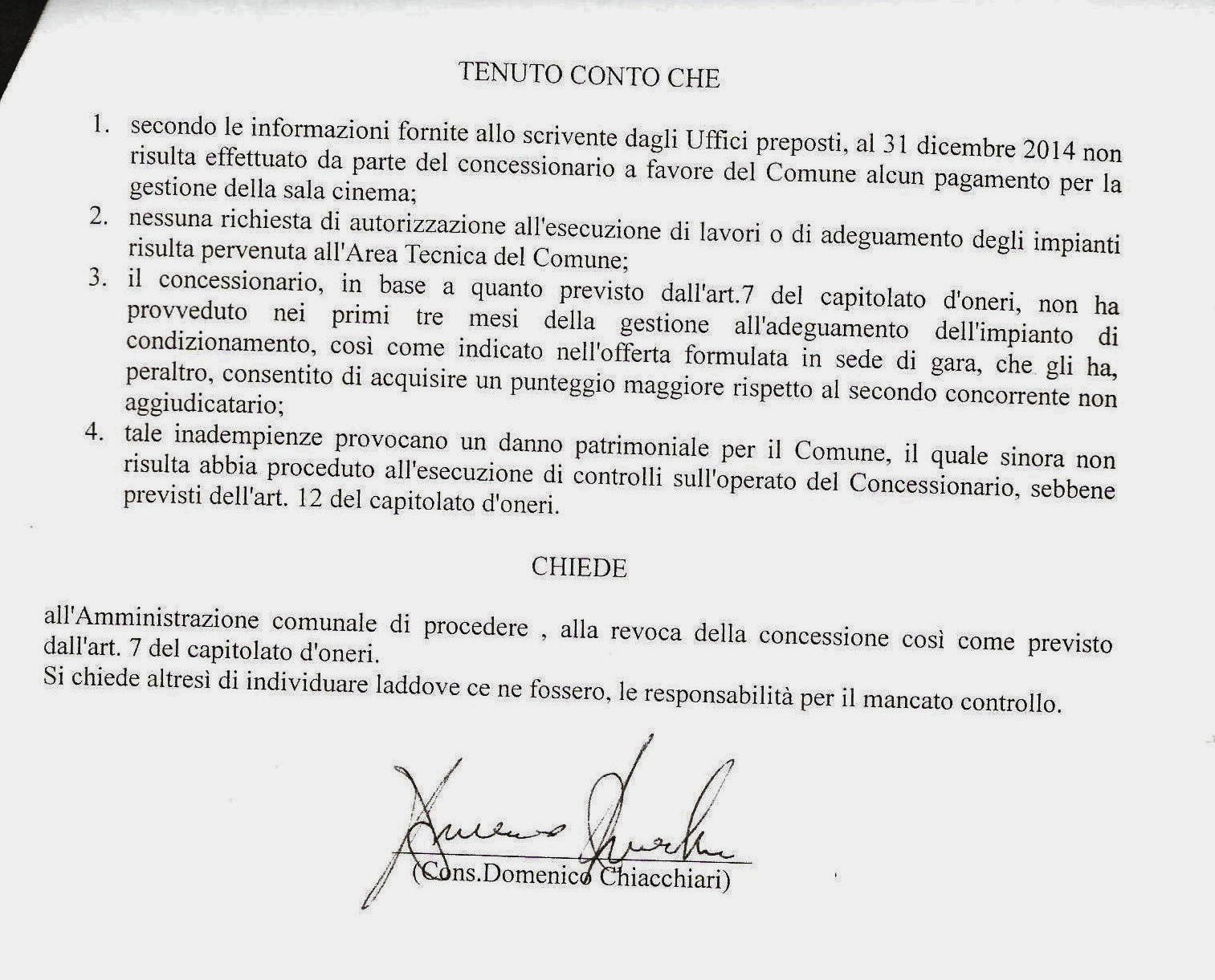 Per tali ragioni, il consigliere Chiacchiari chiede all’amministrazione comunale capitanata dal sindaco Brasiello “di procedere alla revoca della concessione, così come previsto dall’articolo 7 del capitolato d’oneri”.