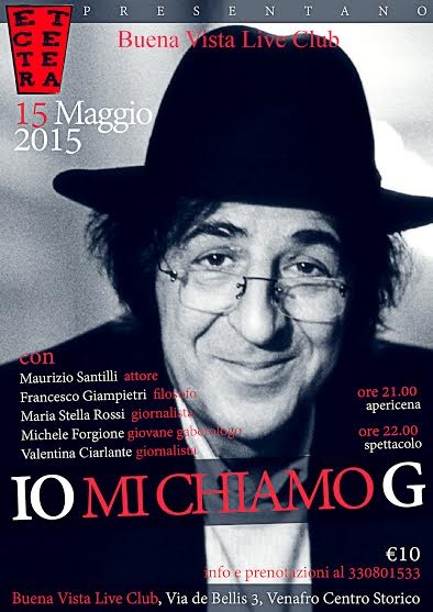 VENAFRO – “Et.Cetera”, associazione culturale della città col coinvolgimento soprattutto di giovani, e “Buena Vista Live Club”, locale d’intrattenimento nel cuore del centro storico venafrano e dinamico laboratorio di idee, uniscono sforzi ed impegni per onorare figura e portata di un artista dello spettacolo nazionale, Giorgio Gaber, cantante/attore/interprete indimenticabile per la genialità delle prove perfomance. “ Io mi chiamo G “ titola infatti l’appuntamento serale del 15 maggio prossimo in calendario presso il citato locale di via de Bellis per ricordare il poliedrico personaggio. Di Gaber e dell’iniziativa a lui dedicata parla Francesco Giampietri, presidente di “Et.Cetera” : “E’ un doveroso tributo a Gaber -spiega il giovane filosofo venafrano- osservatore ed interprete geniale e disincantato delle trasformazioni della società italiana degli ultimi decenni del ‘900. Riscoprire Giorgio Gaber, le sue intuizioni disarmanti e le lungimiranze che lo contraddistinsero può aiutare a decifrare i mutamenti socio/culturali ancora in corso e dagli esiti incerti”. Daranno vita a “ Io mi chiamo G “ Maurizio Santilli, attore e titolare di “Buena Vista Live Club”, il citato Francesco Giampietri quale filososo, le giornaliste Maria Stella Rossi e Valentina Ciarlante ed il “gaberologo” Michele Forgione. Il programma della serata prevede alle h 21,00 l’apericena ed alle h 22,00 lo spettacolo dedicato a Giorgio Gaber. Per info 330/801533.