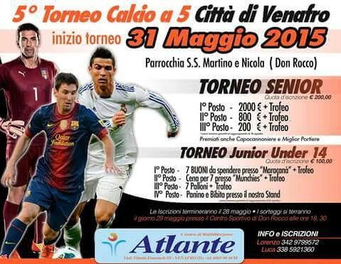 VENAFRO – Sono aperte le iscrizioni per il quinto torneo di calcio a 5 “Città di Venafro”. La manifestazione sportiva inizierà ufficialmente domenica 31 maggio presso il centro sportivo della parrocchia dei santi Martino e Nicola (Don Rocco). La quota d’iscrizione è pari a 200 euro a squadra. Ogni squadra potrà essere composta, tra titolari e riserve, di un numero massimo di otto giocatori. Ogni sera si svolgeranno quattro partite, a partire dalle ore 19 fino alle 23. Alla squadra vincitrice del torneo sarà assegnato un premio di 2mila euro e un trofeo. I sorteggi saranno effettuati venerdì 29 maggio, alle 18 e 30 presso il centro sportivo di Don Rocco. Come nella passata edizione gli organizzatori metteranno a disposizione uno stand con panini e bibite.