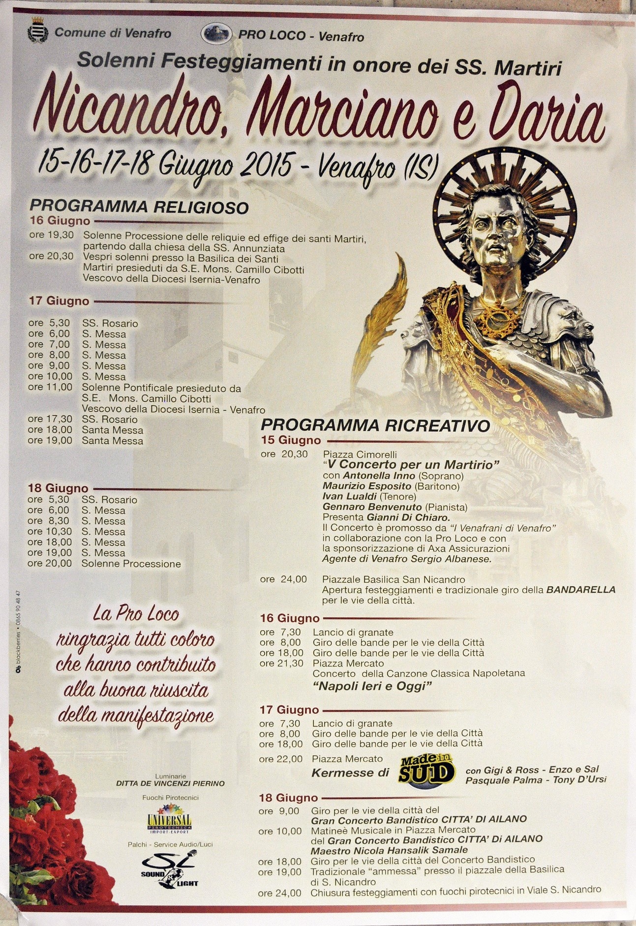 VENAFRO – E’ stato diramato alla città il programma ufficiale della “ Festa di San Nicandro 2015 “, il tradizionale trittico festivo in onore dei Santi Martiri Nicandro, il Patrono, Marciano e Daria. I primi due erano fratelli ed ufficiali dell’esercito dell’antica Roma, la donna moglie di Nicandro. Vennero martirizzati nel 303 d.C. ai tempi dell’Imperatore Diocleziano per aver ribadito la loro fede cristiana e Venafro ogni anno li celebra con grande partecipazione popolare e tantissima intensità.