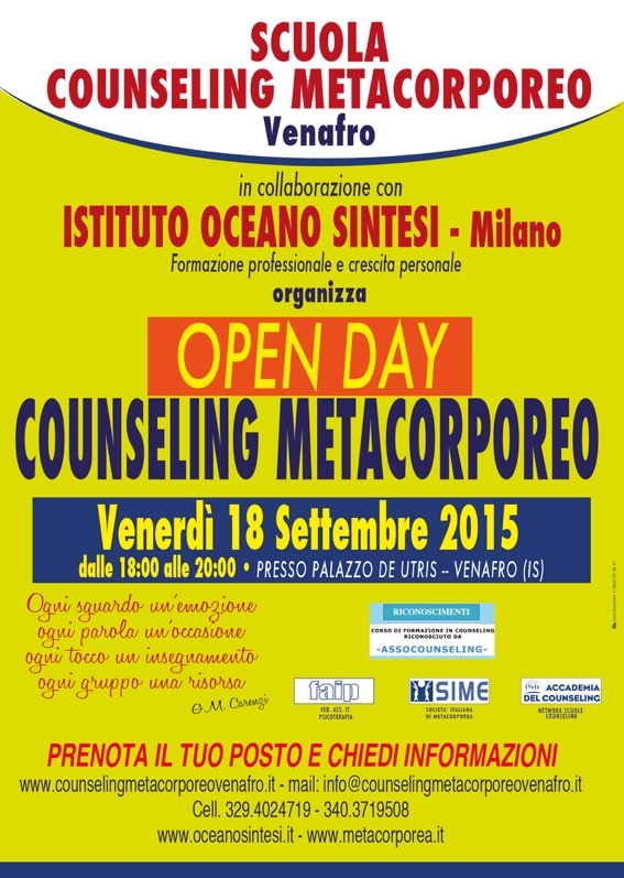 VENAFRO – La Scuola di Counseling Metacorporeo di Venafro in collaborazione con l’ Istituto Oceano Sintesi di Milano organizza Open Day ” Scuola Counseling Metacorporeo”.