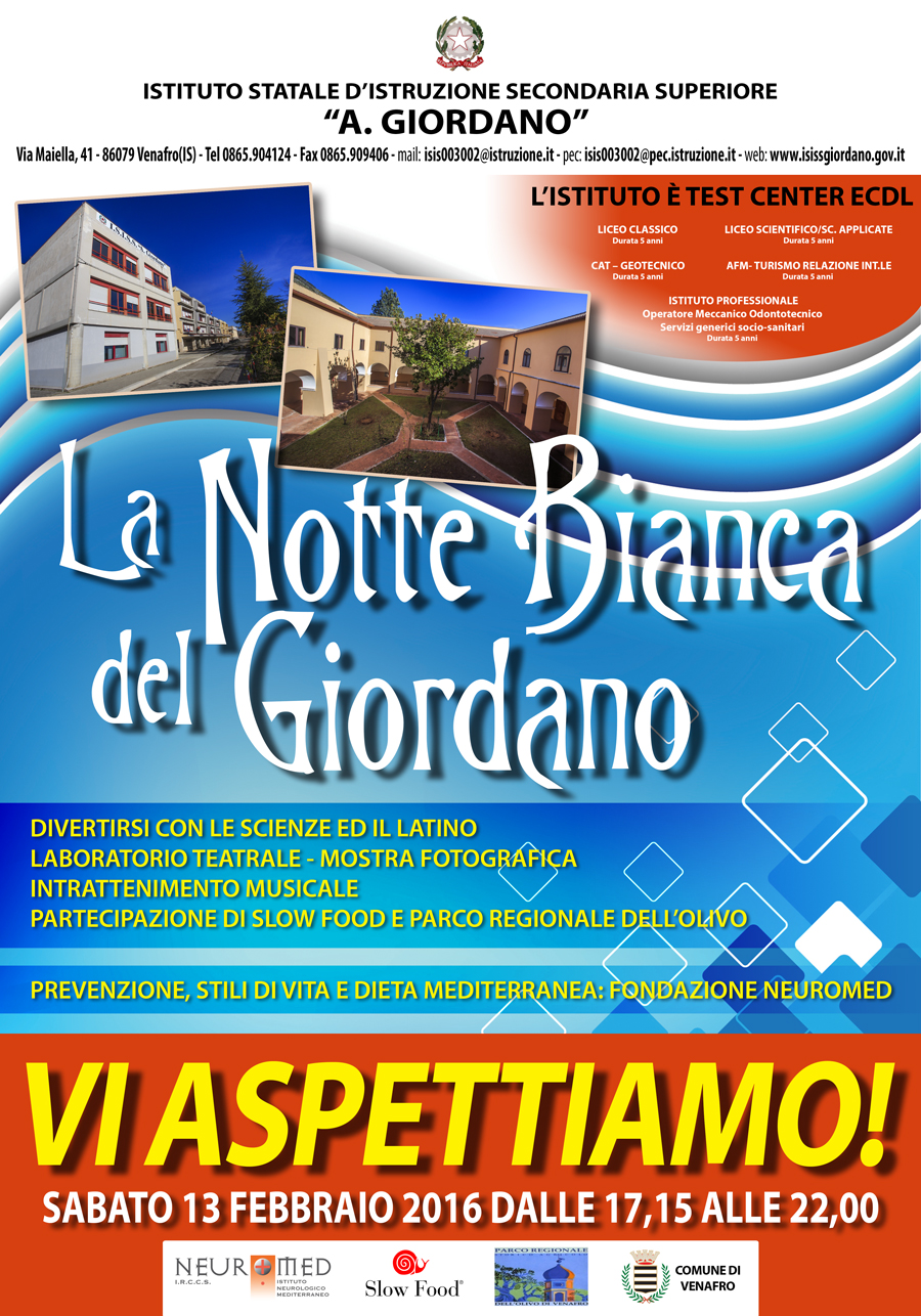 VENAFRO – Il secondo appuntamento dell’Open Day si trasforma ne “La Notte Bianca del Giordano”. Protagonisti gli studenti e le studentesse dei cinque indirizzi (classico, scientifico, Cat, Afm e Odontotecnico) del “Giordano”. L’appuntamento è per sabato 13 febbraio 2016 a partire dalle ore 17,30 presso la sede centrale di Via Maiella. A presenziare l’evento il Direttore Generale dell’Ufficio Scolastico Regionale del Molise dottoressa Anna Paola Sabatini. A fare gli onori di casa il Dirigente Scolastico professoressa Rossella Simeone. Per la massima autorità regionale ci sarà il presidente del consiglio regionale Ingegnere Vincenzo Cotugno, per l’amministrazione locale il sindaco Antonio Sorbo, il vice sindaco Alfredo Ricci e l’Assessore alle politiche sociali Angelamaria Tommasone. Confermata anche la presenza del consigliere regionale Massimiliano Scarabeo. La “Notte Bianca” del Giordano prevede un primo step dalle ore 16 alle ore 17 presso la sede del liceo Classico di via Del Carmine, dove ci sarà una mostra fotografica e un piccolo intrattenimento musicale. A partire dalle ore 17, 15 si apriranno le porte della sede centrale di via Maiella dove avrà inizio la kermesse con L’inno nazionale eseguito da una studentessa liceale, la proiezione del bellissimo video realizzato dagli studenti sull’immenso patrimonio storico-artistico-archeologico della città di Venafro, a seguire  i saluti iniziali delle autorità. “Divertirsi con le Scienze ed il Latino”: intrattenimento a cura degli studenti. “Prevenzione, stili di vita e dieta mediterranea”: con la partecipazione della Fondazione Neuromed che attraverso un gruppo di studenti presenterà una serie di esperimenti sulla tematica oggetto dell’incontro. “Le Improvvisazioni di Versailles”, mini- rappresentazione teatrale a cura del laboratorio teatrale dell’Istituto. Alle 21 evento organizzato in collaborazione con l’Associazione “Slow Food” e Parco Regionale dell’Olivo di Venafro, con la promozione di prodotti tipici locali. Il finale prevede intrattenimento musicale ed eventi culturali a cura degli studenti. Il Giordano dunque vuole sempre più aprirsi al territorio con una proposta concreta nei confronti di tutti i portatori di interesse del territorio, di collaborazione e unità di intenti, per far crescere negli studenti l’impegno civile, la solidarietà e il senso di legalità.