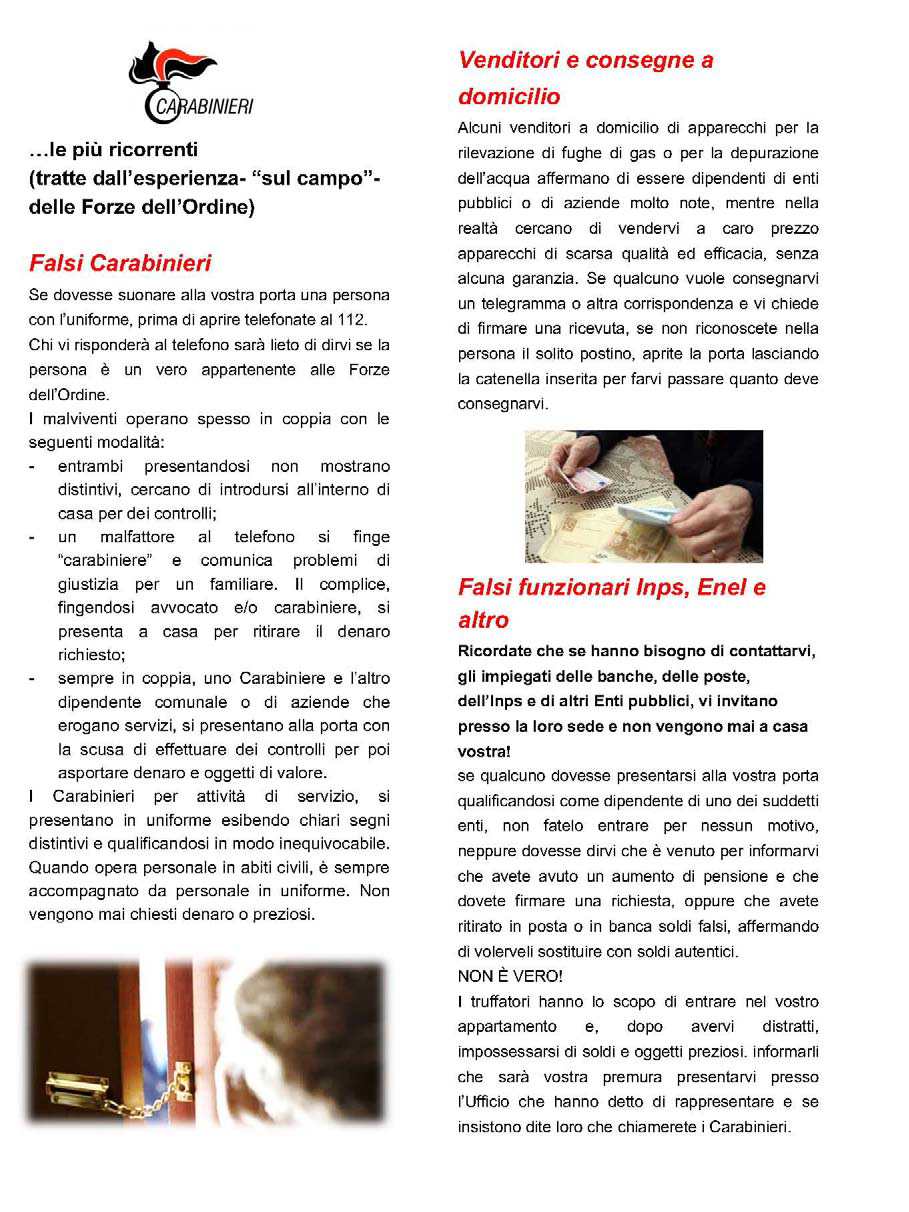 Sempre in coppia, un falso carabiniere e un falso dipendente comunale si presentano in casa con la scusa di dover effettuare dei controlli e poi asportano denaro e oggetti preziosi.