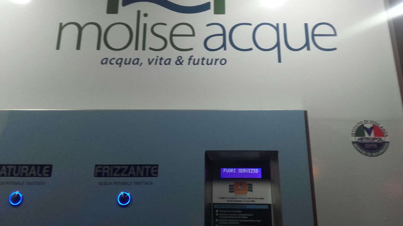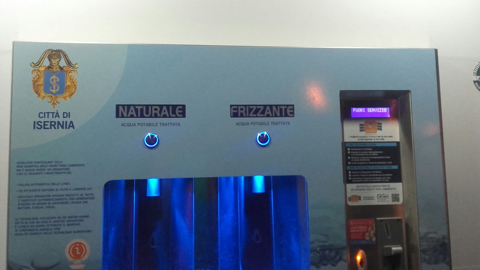 La macchinetta dell’acqua è rimasta a secco, senza dispensare nemmeno una goccia. Poi l’amara scoperta: sul display della tastiera, a chiare lettere, continuava a campeggiare luminosa la dicitura “fuori servizio”. Per chi passa da lontano, illuminata con led e luci celesti, la casetta fa anche la sua bella figura. Ma come spesso accade a Isernia, tutto ha durata effimera. Si pensi al bike sharing o al wifi. Servizi di cui gli isernini, pochi in realtà, hanno usufruito per davvero brevissimi periodi. Ma mai come in questo caso, l’utilizzo è stato circoscritto a poche ore e a pochi fortunati; un servizio veloce come -è il caso di dirlo- “bere un bicchier d’acqua”. Inaugurata solo ieri mattina, a distanza di 24ore, la casetta dell’acqua ha già smesso di funzionare. Ora è da vedere se domani provvederanno a ripristinarla. O, come già accaduto in altre circostanze, anche questo nuovo servizio, offerto alla Città, resterà inutilizzabile per mesi, se non per anni.
