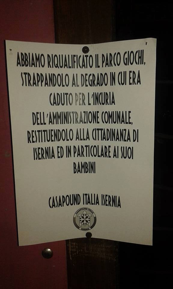 ISERNIA – Si è svolta nel pomeriggio di ieri l’iniziativa di riqualificazione del ‘Parco dei piccoli Ricercatori’ ad opera di CasaPound Italia. Gli aderenti del movimento hanno provveduto alla messa in sicurezza della giostra del parco, riparandone le parti rotte, alla sua pulizia, a tagliare l’erba delle aiuole e a ripulire la fontana degli innumerevoli rifiuti che la riempivano.
