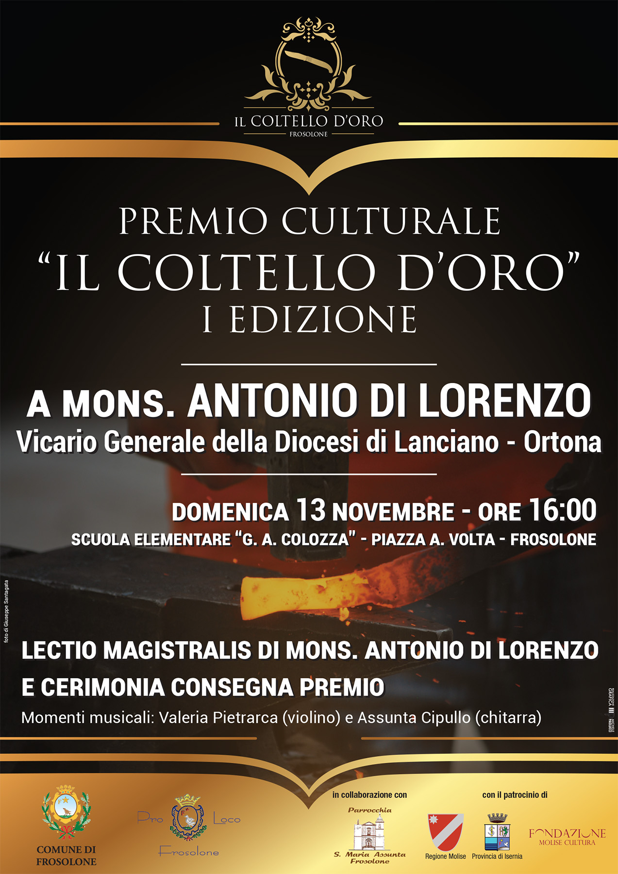 artigiano della cittadina assieme una pergamena con la motivazione del riconoscimento e sarà consegnato, quest’anno a Mons. Antonio Di Lorenzo, Vicario Generale della Diocesi Lanciano-Ortona, in passato professore al ginnasio e sacerdote della Parrocchia di S. Pietro Apostolo di Frosolone. L’evento è organizzato in collaborazione della Parrocchia di Santa Maria Assunta e il patrocinio della Regione Molise, della Provincia di Isernia e della Fondazione Molise Cultura.
