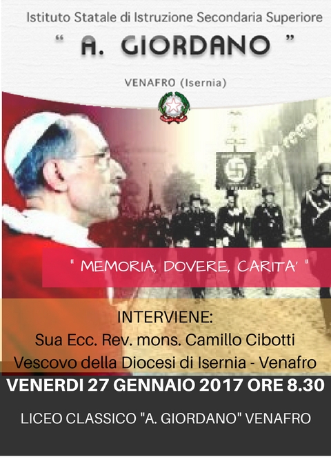 Venerdì 27 gennaio 2017 dalle 8:30 alle 10:30, presso il liceo classico di via del Carmine sarà celebrata la “Giornata della Memoria” con la conferenza del Vescovo della Diocesi di Isernia-Venafro monsignor Camillo Cibotti dal titolo “Memoria, dovere, carità”.