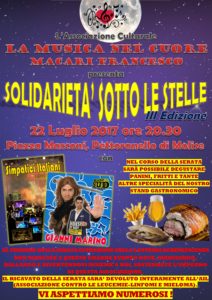 Per centrare il tutto basterà partecipare alla III^ edizione di “Solidarietà sotto le stelle”, in programma a partire dalle h 20,30 in piazza Marconi nell’accogliente Comune dell’isernino su iniziativa dell’Associazione “La Musica nel Cuore – Francesco Macari” e della stessa famiglia Macari, che per il terzo anno consecutivo propone la serata di musica, balli ed intrattenimento per raccogliere fondi da devolvere alla predetta AIL e ricordare il loro Francesco, scomparso giovanissimo per un male terribile.
