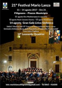 FILIGNANO – Come da manifesto accluso, questo il programma del Festival Mario Lanza 2017 in calendario a Filignano dall’11 al 14 agosto nella piazza principale del Comune che è anche porta sud del Parco Nazionale di Lazio, Abruzzo e Molise.