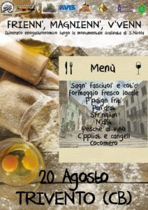 TRIVENTO – Domenica 20 Agosto, lungo la monumentale scalinata di S. Nicola a Trivento, torna, come ormai da molti anni, l’itinerario enogastronomico, un viaggio di sapori e di pietanze della tradizione lungo i vicoli e le piazzette del suggestivo Centro Storico di Trivento.