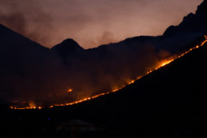 La montagna alle spalle di Venafro continua a bruciare senza sosta. Una immensa torcia che arde nella notte.