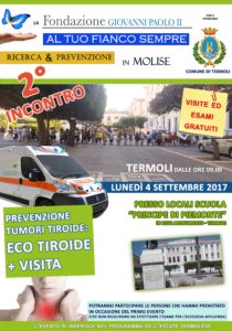 TERMOLI – “Carovana della salute”, un nuovo incontro è stato programmato a Termoli il 4 settembre presso i locali della scuola principale Principe di Piemonte da parte della Fondazione “Giovanni Paolo II” per soddisfare le numerosissime richieste pervenute, dopo il successo del primo appuntamento e quindi l’eccessiva affluenza che non ha permesso a molti di effettuare gli esami previsti.