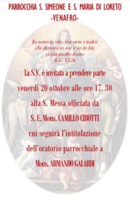Quindi, venerdì 20 ottobre alle ore 17.30 ci sarà la celebrazione della S. Messa officiata da S.E. Mons. Camillo Cibotti al termine della quale si svolgerà la cerimonia di intitolazione dell’oratorio parrocchiale a Mons. Armando Galardi