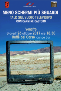 Il titolo dell’evento “Meno schermi più sguardi” vale più di mille parole, si parlerà infatti della televisione generalista, del suo vuoto e dei suoi inganni, non perdendo di vista la ricerca comune a più canali del trash e dell’orrore.