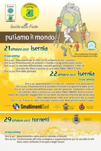 AMBIENTE – Arriva ad Isernia l’iniziativa promossa da Legambiente “Puliamo il mondo” che il 21, 22 e 29 ottobre, in collaborazione con la Smaltimenti Sud e il patrocinio dei Comuni di Isernia, Pesche e Fornelli, coinvolgerà associazioni, scolaresche e volontari.