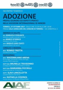 TERMOLI – Un tema assai delicato, quello dell’adozione, sarà affrontato da esperti, sui profili giuridici e negli aspetti pratici grazie all’interessamento dei club Rotary, Interact e Rotaract di Termoli, assieme alla sezione Aiaf, che domani, venerdì 27 ottobre, alle ore 15.30, presso la sala consiliare del Comune di Termoli, parlerà dell’argomento.