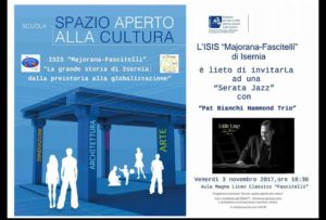ISERNIA – Grande evento all’ISIS Majorana-Fascitelli di Isernia, organizzato in collaborazione con Eddie Lang Jazz Festival, domani, venerdì 3 novembre, alle ore 18.30, concerto presso l’aula magna del Liceo Classico del gruppo Pat Bianchi Hammond Trio.