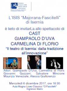 ISERNIA – Appuntamento con il teatro di Isernia, mercoledì 6 dicembre, alle 18.30, presso l’aula magna del Liceo Classico “Fascitelli”.