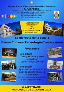 Mercoledì 20 dicembre, a partire dalle ore 10, presso la sede di via Del Carmine sarà inaugurato il “Museo Scolastico Antonio Giordano”. Attraverso un percorso artistico-culturale nei sotterranei della scuola, verrà rappresentata la storia di Venafro con l’esposizione di materiale inedito. Al taglio del nastro parteciperanno le istituzioni del territorio.
