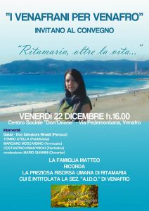 I VENAFRANI PER VENAFRO – Si terrà il prossimo 22 dicembre l’atteso convegno “Ritamaria, oltre la vita…” organizzato dal movimento “I Venafrani per Venafro” in memoria della giovane concittadina.