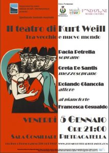 PIETRACATELLA – Venerdì 5 gennaio, alle ore 21, nella sala consiliare del Comune di Pietracatella quattro giovani artisti e musicisti del conservatorio “L. Perosi” di Campobasso si esibiranno nella rivisitazione delle musiche di Kurt Weill.