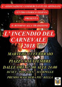 Martedì 13 febbraio, dalle ore 17 fino alle 24, in piazza X settembre, nel cuore del borgo antico isernino, ritorno alla tradizione con l’incendio del Carnevale 2018. L’evento, organizzato dall’Associazione Commercianti ed Artigiani del Centro Storico di Isernia, coinvolgerà per tutto il giorno grandi e piccini.