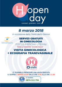 L’8 marzo verrà offerta a donne di qualsiasi età la possibilità di sottoporsi a visite ginecologiche completamente gratuite con ecografia transvaginale. Per partecipare è necessario prenotare. Sarà possibile farlo esclusivamente il giorno 1 marzo 2018 dalle ore 9.00 alle ore 11.00 al numero 0874312794. Nella hall del Centro sarà attivo anche un desk informativo in cui sarà distribuita una pubblicazione dedicata proprio ai fibromi uterini, una breve guida per informarsi e capire cosa fare.