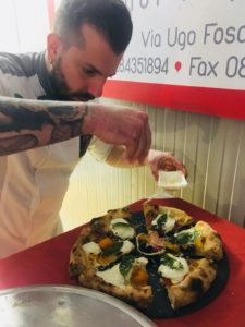A sbalordire il palato dei giudici è stata la “Parmigialla”, una pizza che, con la sua sinfonia di sapori, fa venire l’acquolina in bocca solo a sentire i suoi ingredienti. Impasto leggero, lievitato 24 ore, fatto con farina selezionata e scelta per qualità di proteine, arrivando ad ottenere un impasto al 75% idratazione, pancetta affumicata nostrana, pachino giallo IGP, melanzane a funghetto, mozzarella di bufala DOP e in uscita basilico e scaglie di pecorino stagionato. Il tutto condito da olio extravergine di oliva rigorosamente venafrano.
