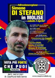 CAMPOBASSO – Sabato 7 aprile il segretario nazionale di CasaPound Italia Simone Di Stefano sarà in Molise per un tour elettorale a sostegno della candidatura di CasaPound Italia alle elezioni regionali del 22 Aprile con Agostino Di Giacomo presidente.
