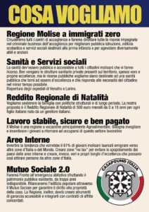 “Siamo molto contenti di questa campagna elettorale, che ci ha permesso di far conoscere le nostre proposte e lo spirito di CasaPound Italia a tutti i molisani. Ora chiediamo ai nostri corregionali di votarci per dar sostenere alle nostre proposte, quali lo stop al business dell’accoglienza degli immigrati costruito sulle spalle dei cittadini molisani, il reddito regionale di natalità, il Mutuo sociale e gli incentivi per le aree interne, e per dar forza all’idea di politica come servizio alla comunità e di una classe politica rinnovata e formatasi nell’impegno quotidiano del sociale che il nostro movimento incarna. Di una cosa i molisani possono essere sicuri: passate le elezioni CasaPound Italia non scomparirà, ma proseguirà con l’impegno concreto che da anni porta a sostegno dei molisani su tutto il territorio regionale”.