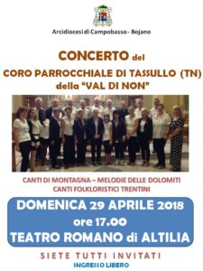 SEPINO – Domenica 29 aprile 2018, alle ore 17:00, nella zona archeologica di Sepino il coro trentino di Tassullo si esibirà, per la prima volta in Molise con canti polifonici della tradizione popolare della Val di Non.