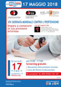 In occasione della XIV Giornata Mondiale contro l’Ipertensione Arteriosa il Dipartimento di AngioCardioNeurologia e Medicina Traslazionale dell’I.R.C.C.S. Neuromed promuove una giornata di screening gratuiti con consulto medico. Appuntamento giovedì, 17 maggio, dalle ore 9.00 alle ore 17.00 presso la Clinica Neuromed in Via Atinense, Pozzilli. Per prenotazioni e info è possibile rivolgersi ai numeri 0865.929560 – 624 – 601.