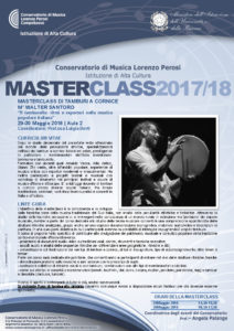 Martedì 29 e mercoledì 30 maggio si terrà la masterclass di Walter Santoro “I tamburi a cornice: ritmi e repertori nella musica popolare italiana”. L’obiettivo è quello di far conoscere e sviluppare le tecniche base della musica tradizionale del Sud Italia, analizzandone peculiarità stilistiche e timbriche.