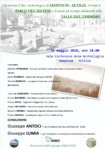 CAMPOBASSO – Il 31 maggio 2018 alle ore 18.00 nell’emblematica cornice del sito archeologico di Saepinum–Altilia posto sul Tratturo Pescasseroli–Candela alle falde del Massiccio del Matese e a ridosso del fiume Tammaro, si terrà un evento promosso per discutere sulle iniziative da intraprendere per valorizzare i beni storici, paesaggistici, ambientali, artistici e culturali della Valle del Tammaro, e le opportunità di sviluppo turistico, agro-zootecnico, artigianale e commerciale del territorio.