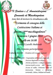 MACCHIAGODENA – L’Amministrazione Comunale di Macchiagodena, nell’ambito delle celebrazioni per i 72 anni della Repubblica italiana, promuove  la cerimonia di consegna della Costituzione ai giovani del paese che hanno compiuto i 18 anni di età.