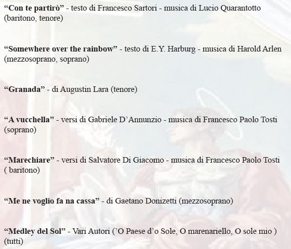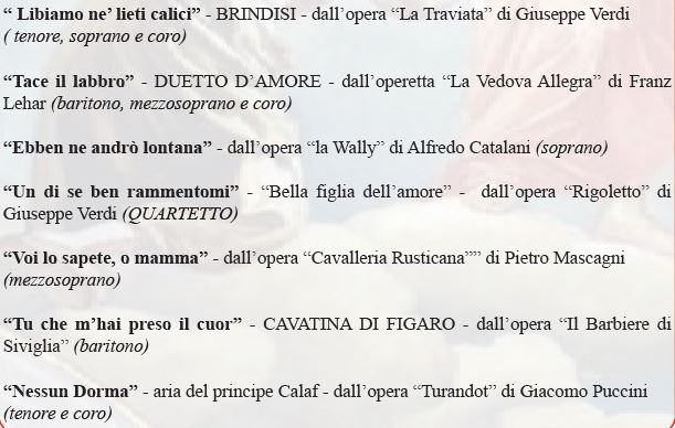 Sotto la direzione artistica del baritono Maurizio Esposito, ad interpretare le più belle arie d’opera, operetta e classiche canzoni internazionali saranno Federica D’Antonino, soprano, Roberta Fanari, mezzosoprano, Ivan Lualdi, tenore, Maurizio Esposito, baritono, e Carlo Feola, pianista.