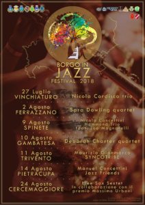 Si parte il 27 luglio da Vinchiaturo con il Nicola Cordisco Trio per poi giungere a Ferrazzano, il 2 agosto, con il Sara Dowling quartet che vedrà, insieme alla cantante britannica in tour in Italia, la presenza del talento molisano Luca Santaniello, batterista campobassano da anni attivo a New York. Il 9 agosto si continua nel centro storico di Spinete con Nicola Concettini Hammond Trio e la partecipazione speciale del famoso trombettista americano Joe Magnarelli. Il 10 agosto è il turno di Gambatesa che, all’ombra del Castello Di Capua, ospita l’ennesima artista internazionale, la cantante statunitense Deborah Charter e il suo quartetto. Dal Fortore al Trigno con la data di Trivento fissata l’11 di agosto e l’esibizione di una colonna del jazz italiano, il sassofonista Maurizio Gianmarco con SyncoTribe. Il 14 agosto tocca a Pietracupa e a un altro molisano, il trombettista Manuel Concettini e Jazz Friends. A chiudere l’edizione 2018 Cercemaggiore con il Free Sax Sextet che coinvolge sassofonisti jazz vincitori del Premio Massimo Urbani che si assegna annualmente a Camerino nelle Marche. In tutti gli eventi sono previste degustazioni enogastronomiche ed esposizioni artistiche arricchite altresì da visite guidate nei principali luoghi di interesse dei borghi coinvolti. Amplissimo e variegato il partenariato della manifestazione che vede operativi i Comuni di Cercemaggiore, Gambatesa, Ferrazzano, Spinete, Trivento e Pietracupa, l’Ass. Culturale “Borgo in Jazz”, l’AIS Molise, il Liceo Artistico Manzù di Campobasso (che ha realizzato la parte grafica), l’UNPLI Molise, le pro-loco di Cercemaggiore, Ferrazzano, Vinchiaturo e Trivento.