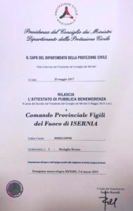 Durante la cerimonia, presieduta dal Capo Dipartimento della Protezione Civile Dott. Angelo Borrelli, è stato consegnato anche al Comando Provinciale dei Vigili del Fuoco di Isernia un attestato di pubblica benemerenza e medaglia di bronzo, a titolo collettivo, per l’emergenza meteorologica del 5 e 6 marzo 2015, in cui il personale operativo si distinse per l’alta professionalità e per aver portato, in un momento di particolare disagio per la provincia, soccorso anche in comuni delle provincie limitrofe.
