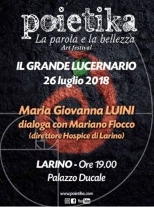 Giovedì sera, dalle ore 19 negli spazi del Palazzo Ducale, Poietika ospiterà la scrittrice Maria Giovanna Luini, con lei dialogherà il dottore Mariano Flocco, direttore dell’Hospice Madre Teresa di Calcutta del centro frentano.