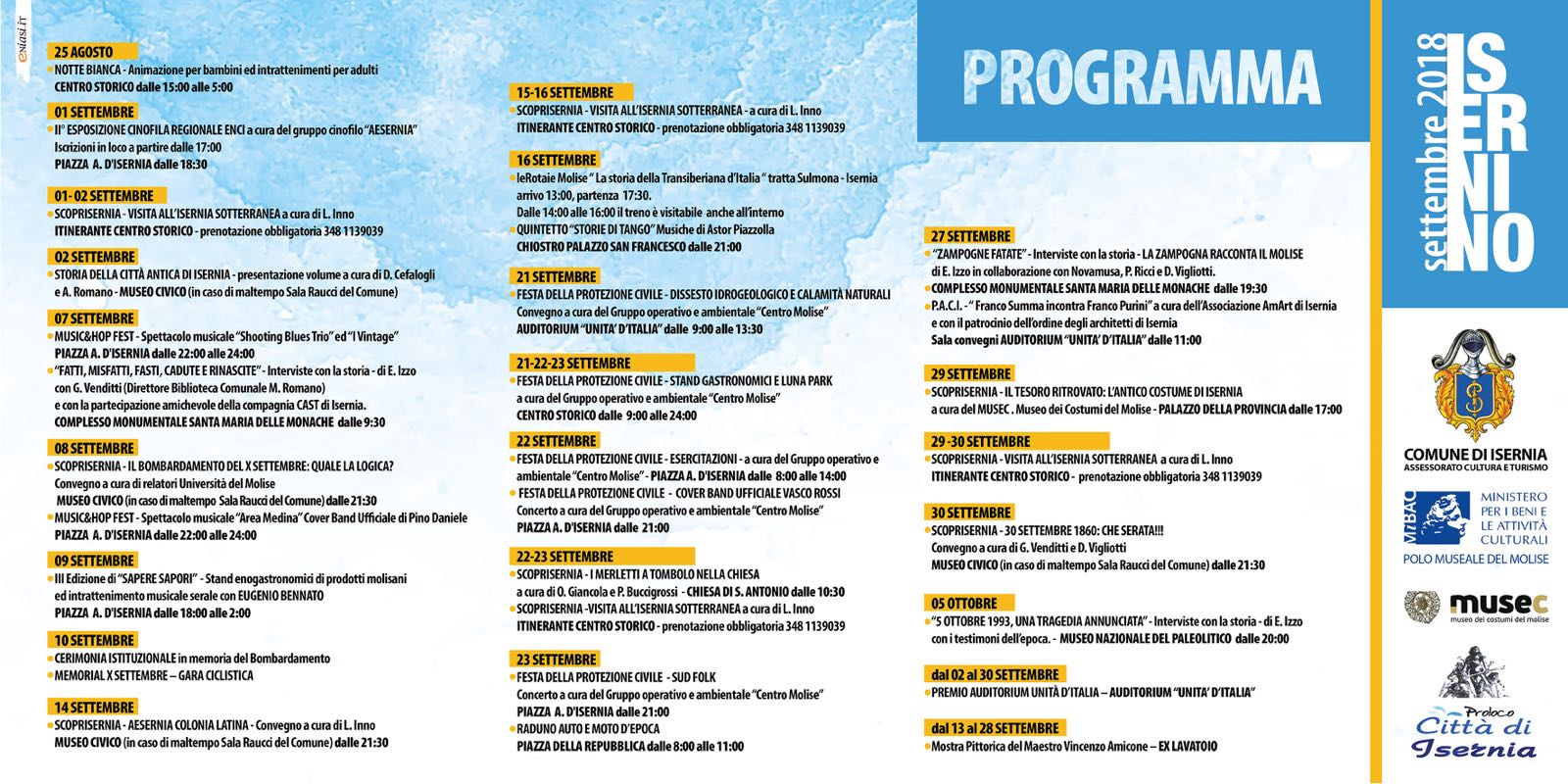 Da segnalare: il 9 settembre, il concerto di Eugenio Bennato; dal 2 al 30 settembre, la mostra d’arte del PACI (Premio Auditorium città di Isernia), il 2 settembre, la presentazione del volume “Storia della città antica di Isernia”; l’8 settembre il convegno sul bombardamento del 1943.