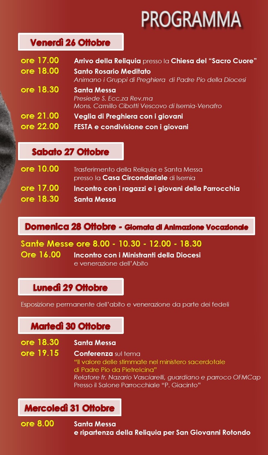 Nei giorni prossimi, dal 26 al 31 ottobre, i Frati Cappuccini presenti al Sacro Cuore, d’intesa con i confratelli che compongono l’equipe di Pastorale Giovanile Vocazionale dei Cappuccini, ospiteranno l’abito delle stimmate di Padre Pio, proponendo anche una Conferenza dal tema “Il valore delle Stimmate nel ministero sacerdotale di San Pio da Pietrelcina”.