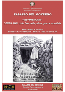 FESTA UNITA’ – Il 4 novembre 2018, in occasione del centenario dalla fine della prima guerra mondiale, il Prefetto di Campobasso Maria Guia Federico aprirà ai cittadini i Saloni del Palazzo del Governo quale prestigiosa cornice della Mostra Storica “Cento anni dalla fine della prima guerra mondiale” che sarà possibile visitare dalle ore 12.00 alle ore 19.00.