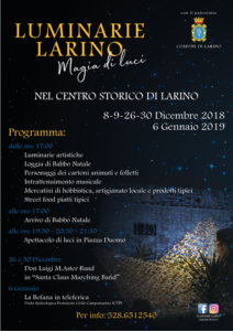 Per il secondo anno tornano le luminarie di Larino, un’iniziativa dell’associazione “Larino nel cuore” per valorizzare il centro storico del paese. In questa edizione ci saranno nuove luminarie artistiche, la loggia di Babbo Natale, dove i bambini potranno consegnare le loro letterine, personaggi dei cartoni animati e folletti, mercatini di hobbistica, artigianato locale e prodotti tipici, street food di piatti tipici ed un ricco intrattenimento musicale.