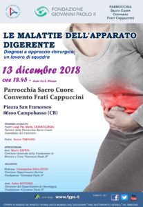 CAMPOBASSO – “Le malattie dell’Apparato Digerente, approccio medico e chirurgico”, è il tema del convegno promosso dalla Fondazione “Giovanni Paolo II” e dall’Associazione “A.Barelli – Amici della Cattolica” in collaborazione con la Parrocchia “Sacro Cuore” – Convento Cappuccini di Campobasso che si terrà il prossimo giovedì 13 dicembre alle ore 18.45 presso i locali della Parrocchia in Piazza S. Francesco, 12.