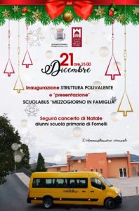 L’evento, al quale prenderanno parte autorità civili e militari, sarà anche occasione per presentare al pubblico, con una piccola festicciola, il nuovo scuolabus ottenuto con la vittoria del programma televisivo “Mezzogiorno in Famiglia” e già in dotazione e uso da parte del Comune di Fornelli.